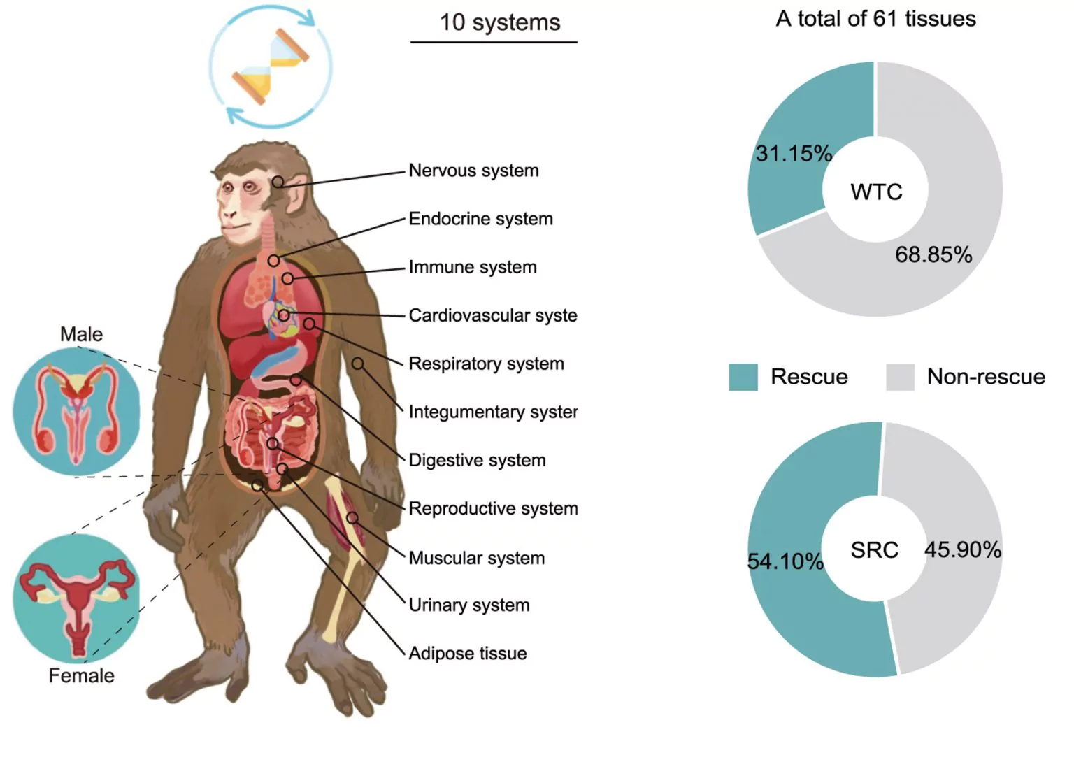 Over 50% of 61 tissue types showed reversal of aging. Lungs, heart, reproductive system, skin, and muscles all got younger at the cellular level.