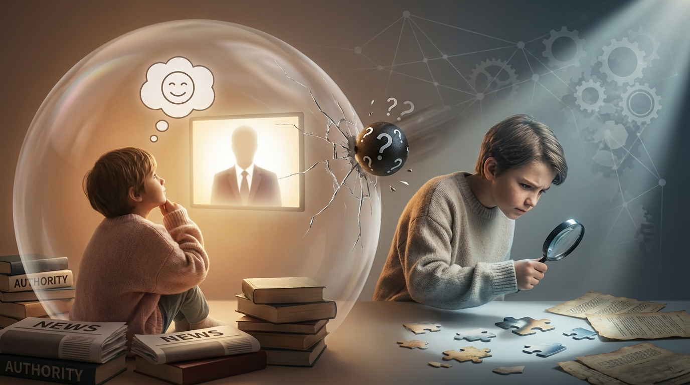 You're trusting everything at face value, like a kid believing whatever authorities say (parents, news, experts). It's simple, but leaves you wide open.